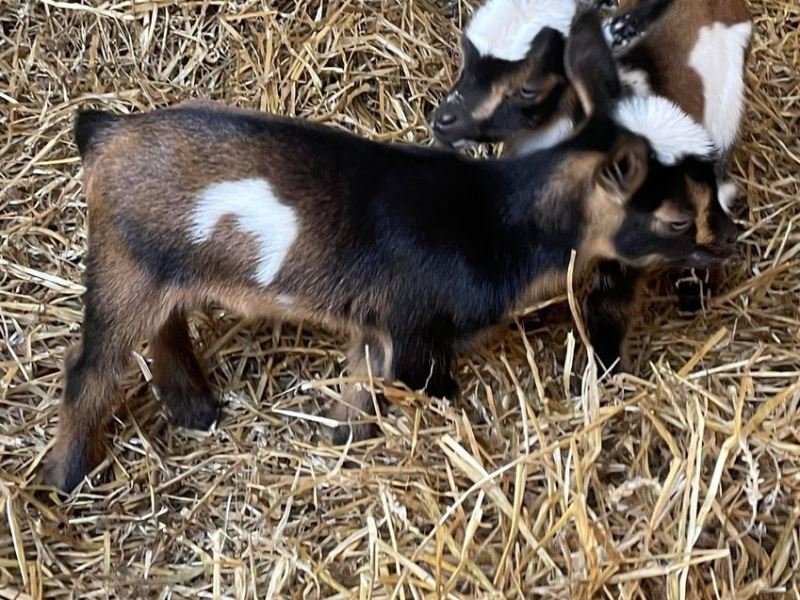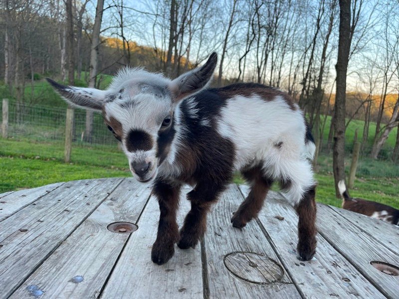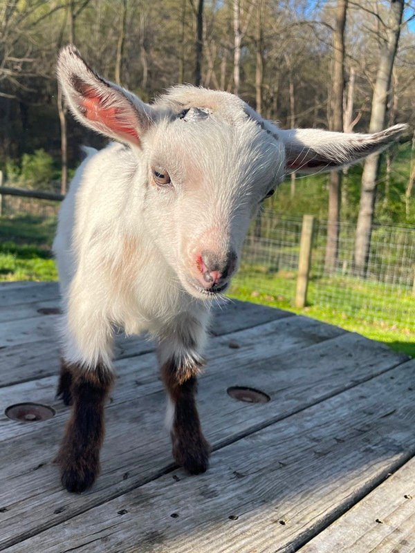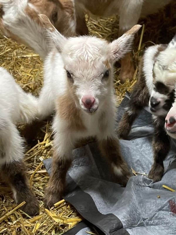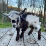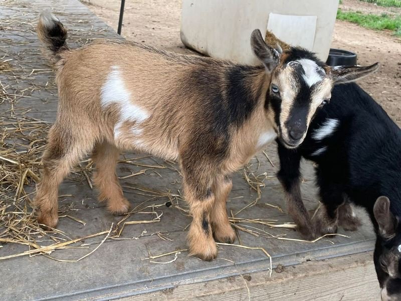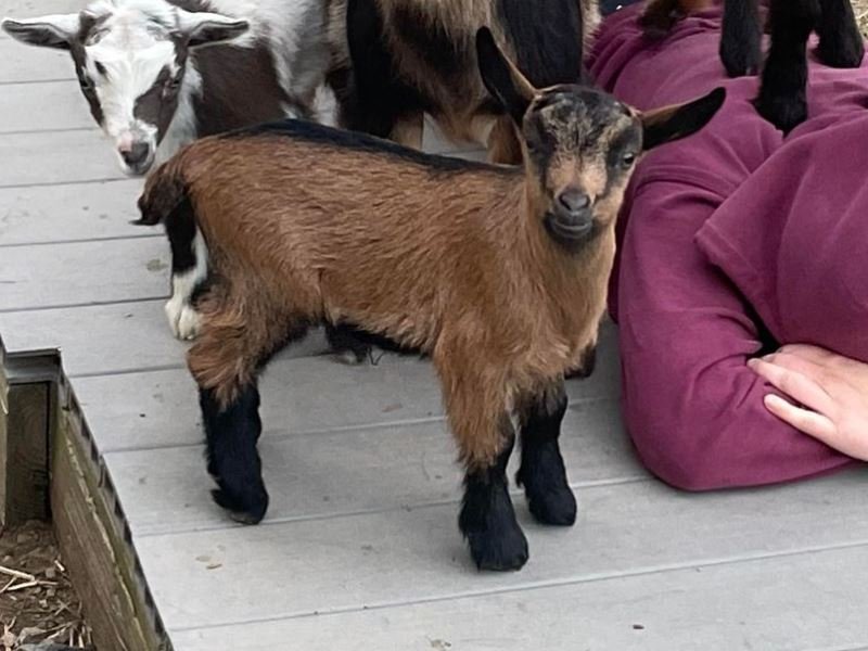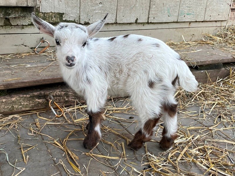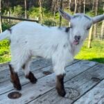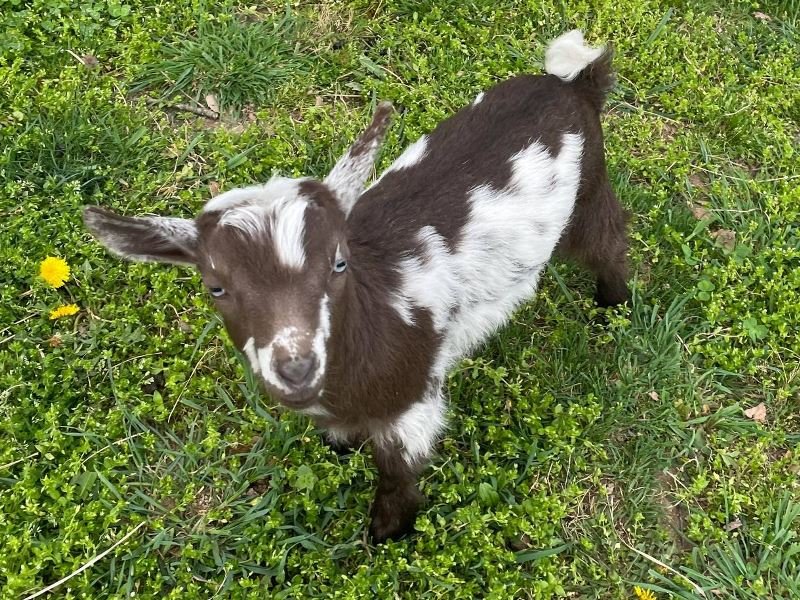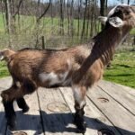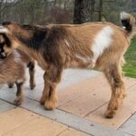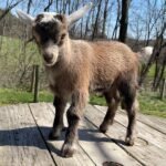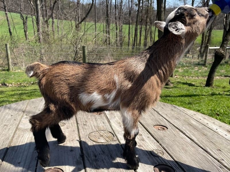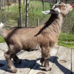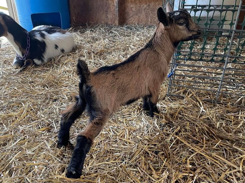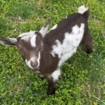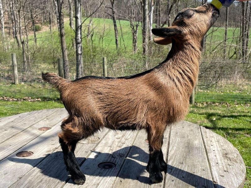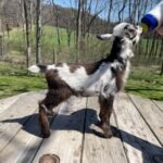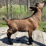 Bailey’s came to us in the fall last year with her daughter Mavis. She’s quite small in size, much smaller than our other Nigerians. After going through a breeding season with her, we don’t wish to keep breeding her. We like our goats a bit bigger. We did have to pull kids this year and struggled to fit inside between her hip bones. Not that she’ll have issues in the future as she did have 2 kiddings prior to coming here that were completely unassisted. We just ended up having quints in there and they were quite tangled and needed some help. Bailey’s had a pretty rough delivery but she’s doing fine now. I hate to put her through that again here. Ideally, I’d love to see her go to a performance home where she can continue to produce beautiful kids. She would need to have someone with smaller hands to be able to assist or be willing to work with a vet that can assist. She also has the option of just being loved as a pet. She’s a sweet goat and easy to handle.